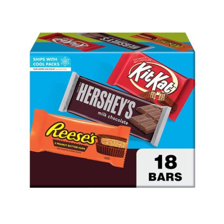 Contains one (1) 27.3-ounce, 18-count variety pack of REESE’S, HERSHEY’S and KIT KAT Milk Chocolate Assortment Candy Bars