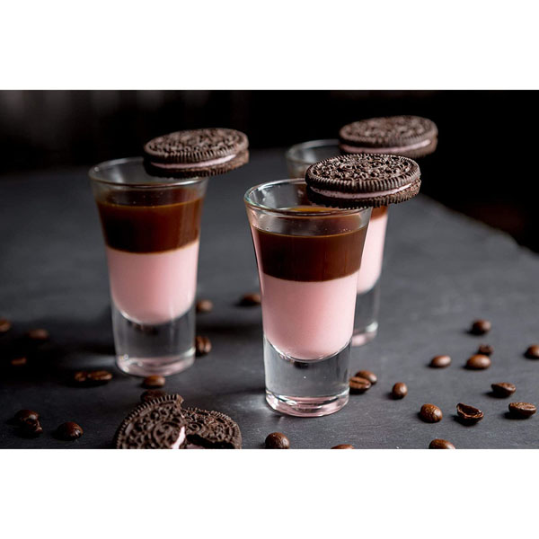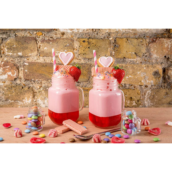 Freak On A Leash CocktailSet 100ml strawberry jelly in two chunky glasses. Blend 50ml Tequila Rose, 40ml butterscotch syrup, 30ml strawberry puree, 80ml vanilla ice cream and 30ml milk, and pour on top of the jelly. Garnish with strawberries, pink wafer and sprinkles. |