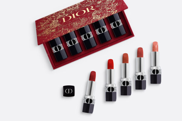 Decorated with an elegant fabric and enhanced with sketches by artist Pietro Ruffo, this Rouge Dior set is reusable. On opening, the set reveals 5 refillable Rouge Dior lipsticks in a velvet finish – shades 720, 760, 840 and 999 – and a satin balm finish – 525.